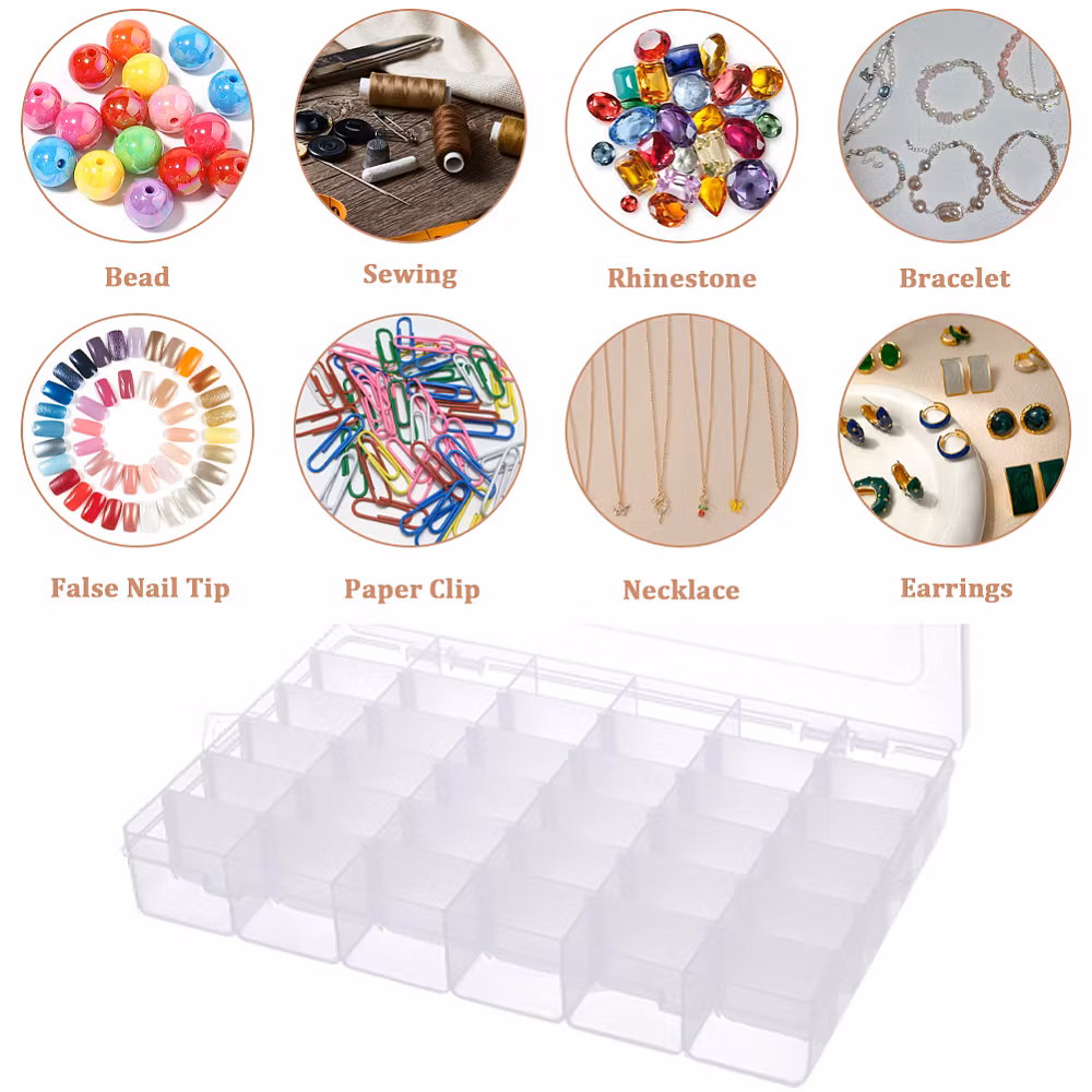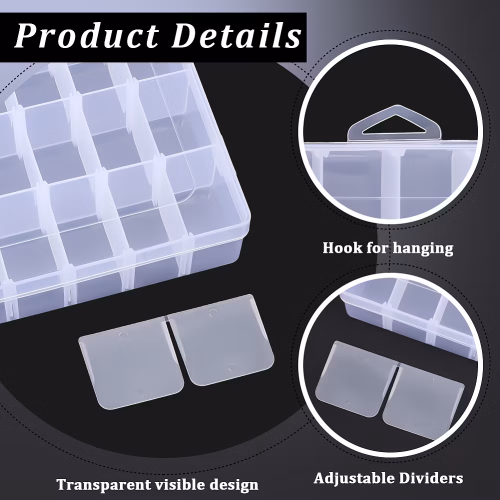 genomskinliga, justerbara avdelare i plast med gångjärnsförsett lock,